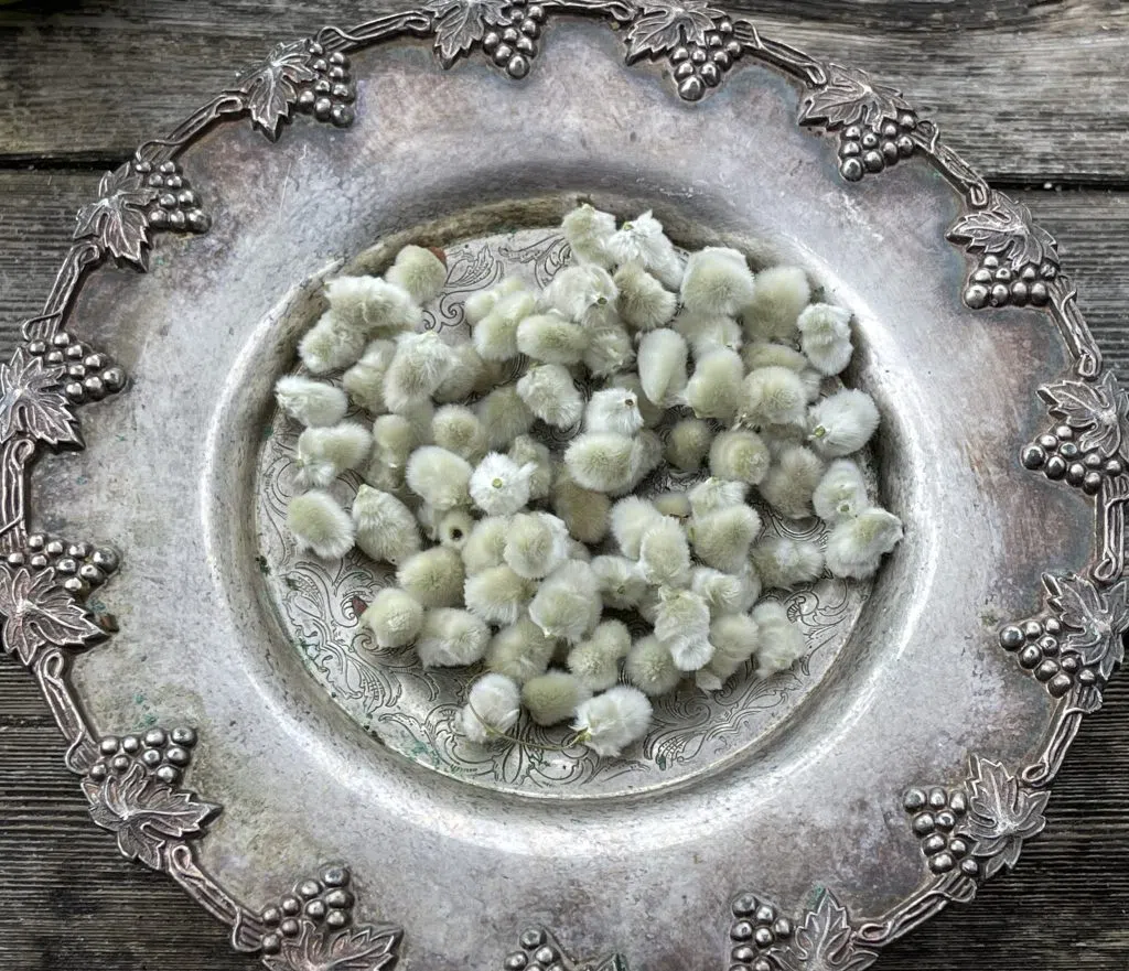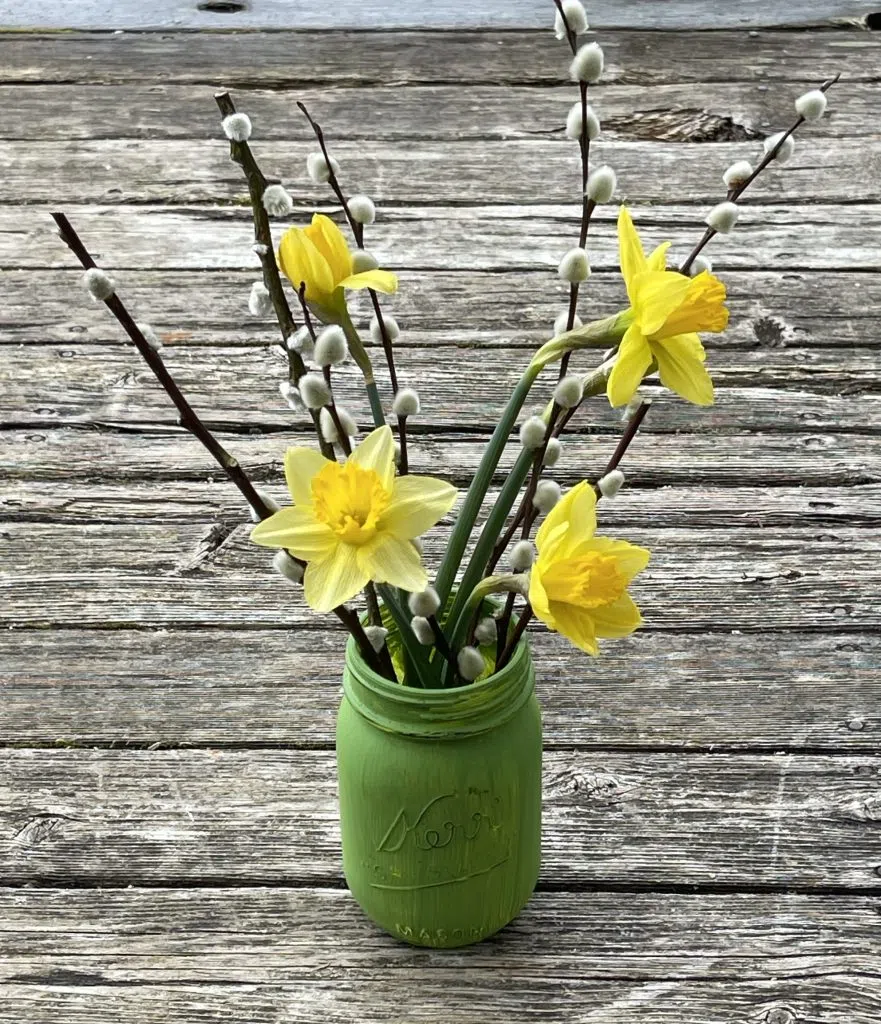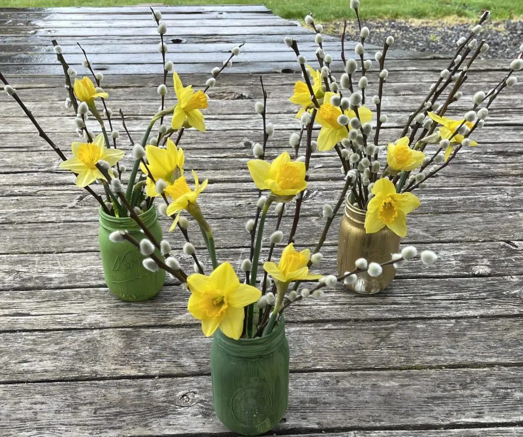 When everything is dry, take a walk outside and trim whatever greenery you can find. I added pussy willows and daffodils from the grocery store. I have loved pussy willows ever since I was a young child. There is something magical about the fuzzy catkins.