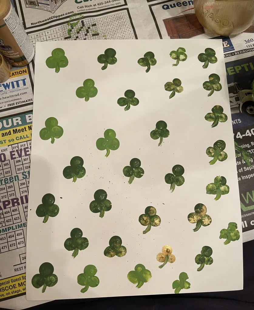 Extra craft: Let the kids dip their fingers into any leftover paint and make three fingerprints in the shape of a clover. Add the stems with a paintbrush.
