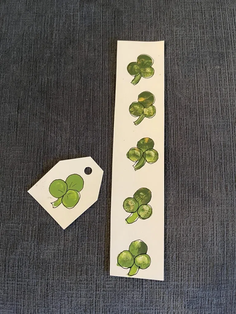 Outline the shamrocks with pen if desired. Make them in a row for a bookmark or turn them into tags for a pot of clover. Grandparents will love them!