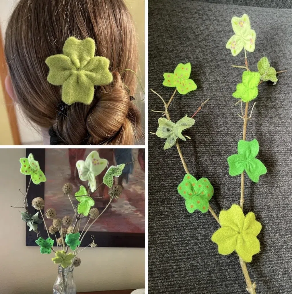 Last year, I made green felt shamrocks. They can be put onto barrettes, headbands, stems from the yard, or anywhere else you can think of. They sew together in a flash. I’m going to make more of them this year and add them to my collection.