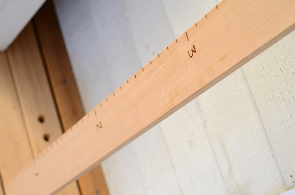 Decide how far off the floor you want your ruler to hang. Account for this and then make one-inch pencil marks all the way up the ruler. Mine would be hanging four inches above the floor so the bottom of the piece of wood would be the ‘four-inch’ mark, and that’s where I started my hash marks.