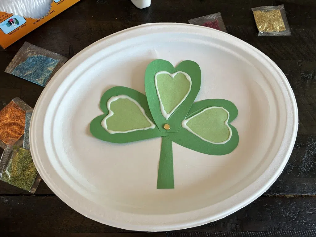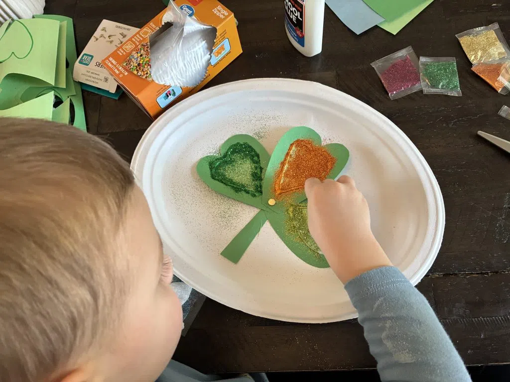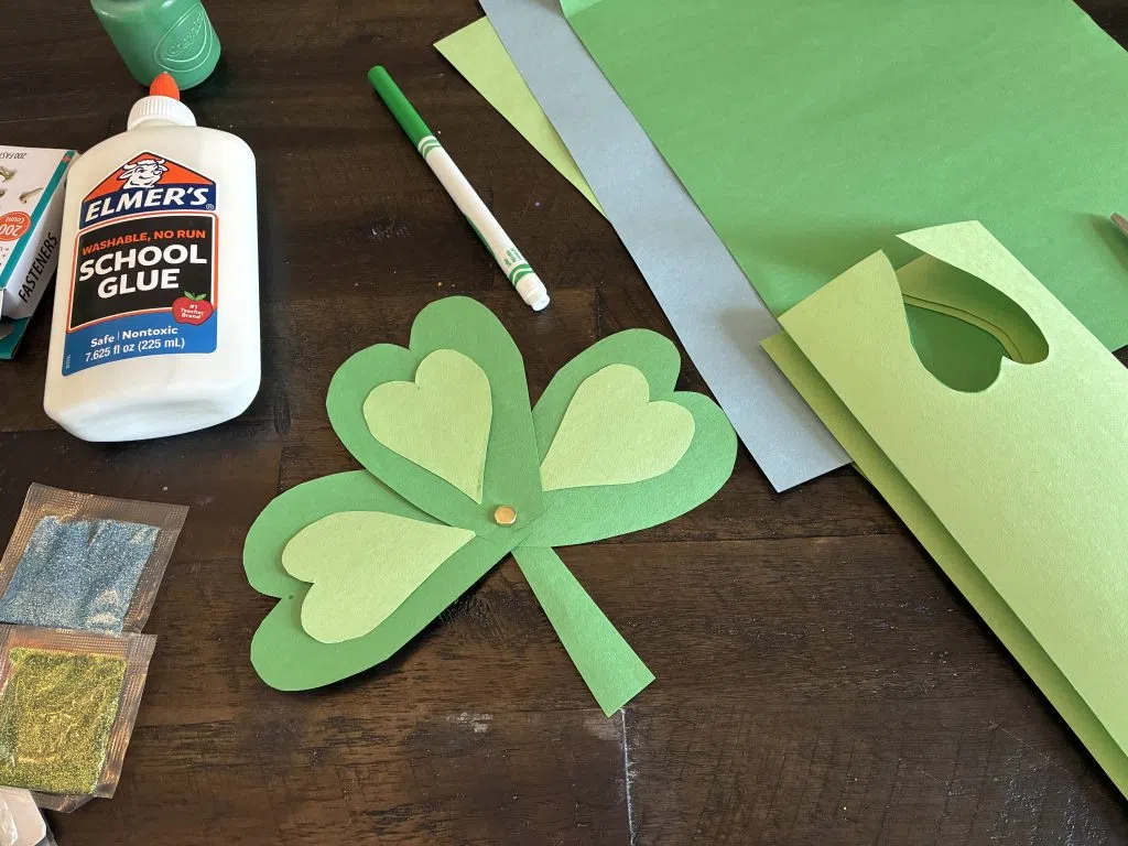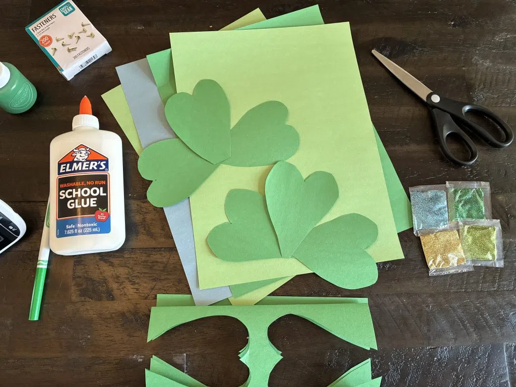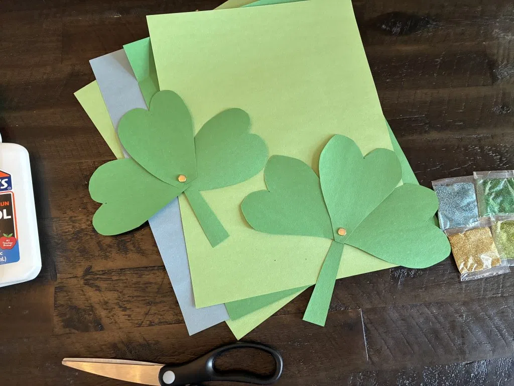 If you don’t have any fasteners, you can always draw a shamrock on the construction paper and cut it out whole! As your kids decorate their leaves, tell them the story of St. Patrick and what each leaf of the shamrock represents.