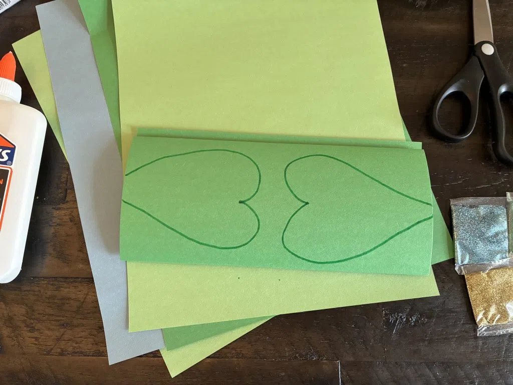 Fold it into three equal columns. While it’s folded, draw the pattern for your leaves on each side. This will give you six leaves total for making two shamrocks. It should look like a long heart-shape.