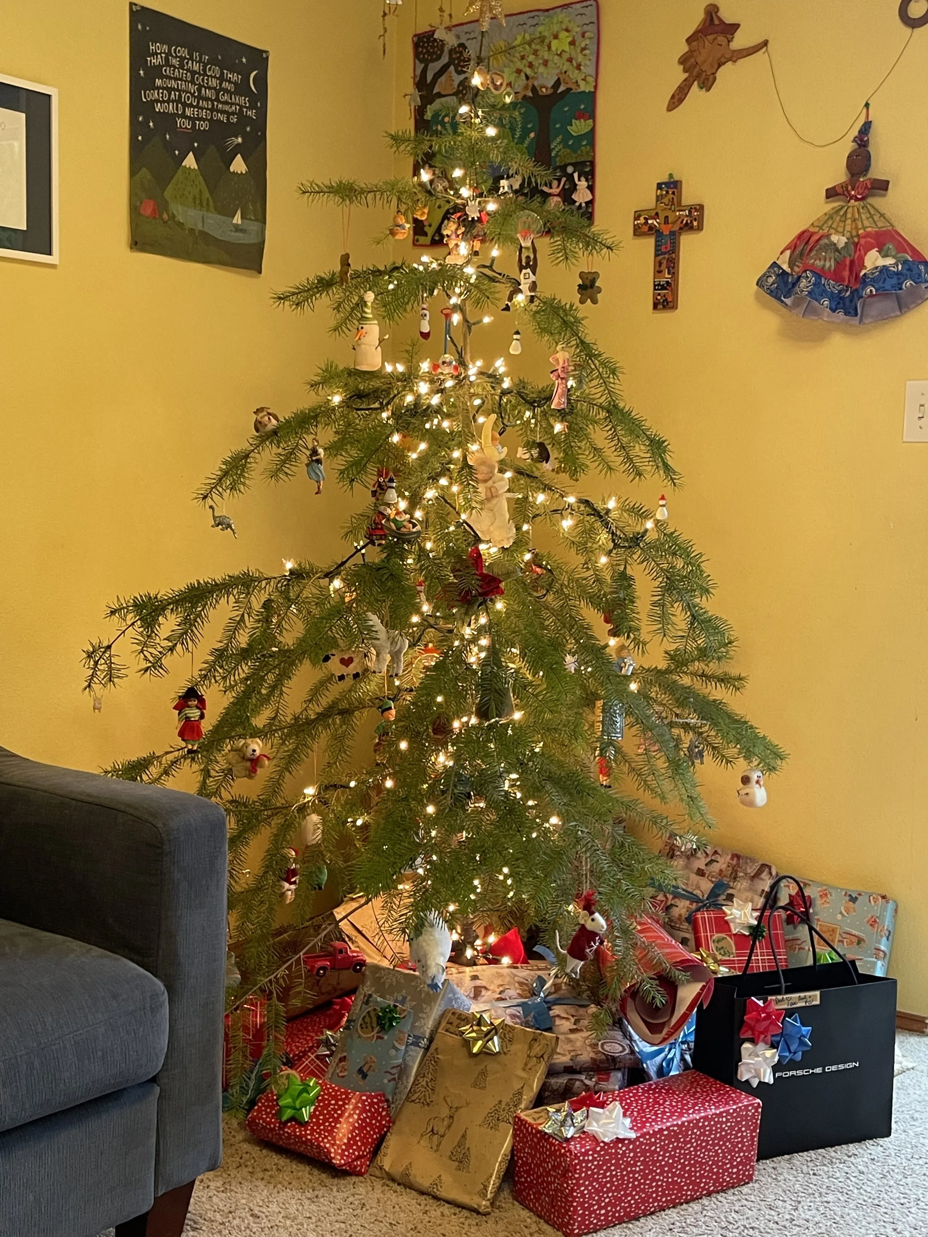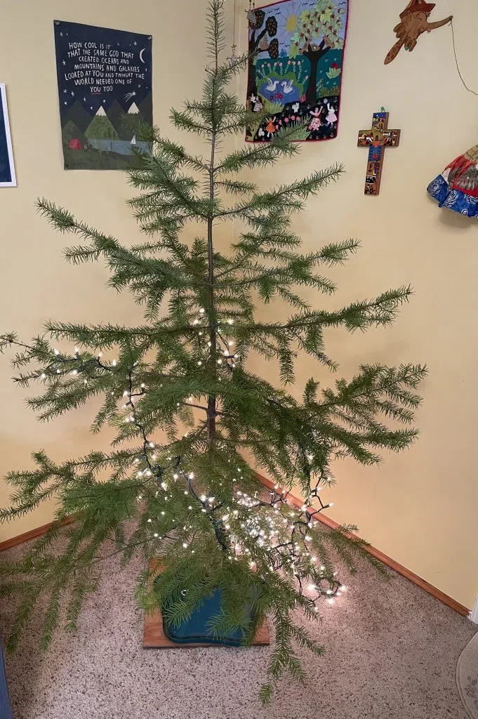 When I finally did get the lights on (in tiny increments) I opened my huge ornament tote and sighed. I have a big collection of lovely ornaments that I gathered over the years. Just looking at them all made me want to cry. I started putting them on the tree and a voice whispered in my ear, “There is no rule that you have to use them all.” My heart lifted and I packed the tote away with half of the ornaments still in boxes. No one even noticed and I loved my funny little tree.